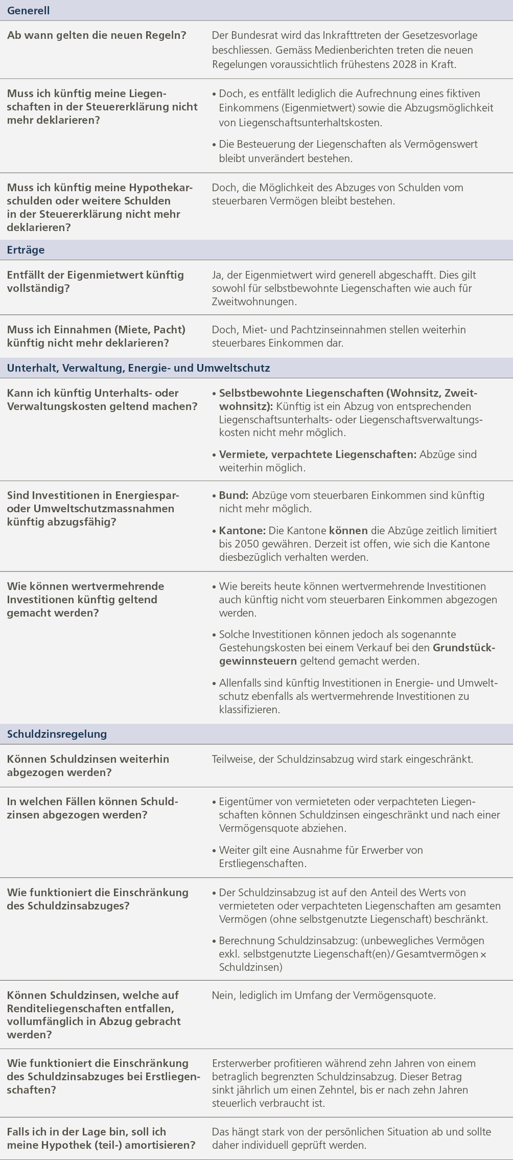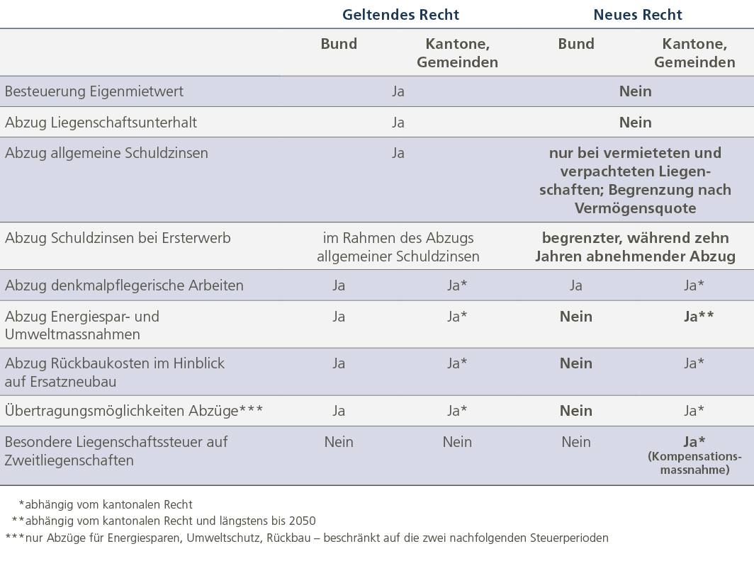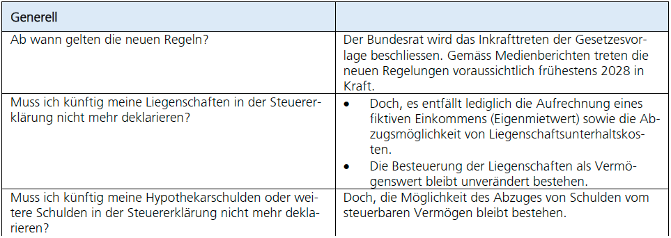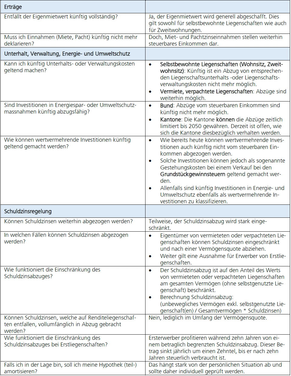Die Änderungen betreffen in erster Linie selbstbewohnte Liegenschaften. Einerseits entfällt die Eigenmietwertbesteuerung, andererseits können für diese Liegenschaften keine Unterhaltskosten mehr geltend gemacht werden. Ein Schuldzinsabzug für selbstbewohnte Liegenschaften ist nur für Ersterwerber und während längstens 10 Jahren möglich.