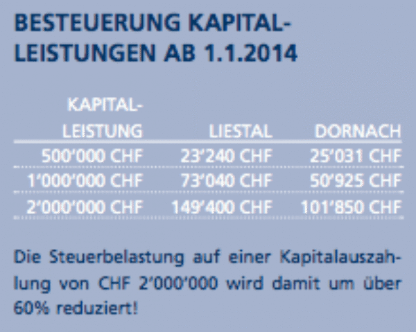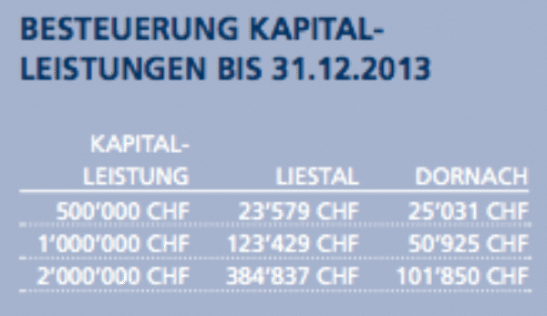 Auch bei der Besteuerung solcher Leistungen greift in der Schweiz die Tarifautonomie der Kantone, was sich in grossen Unterschieden bei der Steuerbelastung manifestiert. Der Kanton Basel-Landschaft brachte diesbezüglich bislang einen stark progressiven Tarif zur Anwendung. Dies führte dazu, dass Kapitalleistungen bis zu einer Höhe von rund CHF 400’000 äusserst attraktiv besteuert wurden. Erst bei Kapitalauszahlungen über dieser Grenze setzte die Progressionswirkung ein, was im gesamt schweizerischen Vergleich zu weit überdurchschnittlichen Besteuerungen führte. Folgender Vergleich zwischen den Gemeinden Liestal und Dornach (SO) soll dies verdeutlichen: