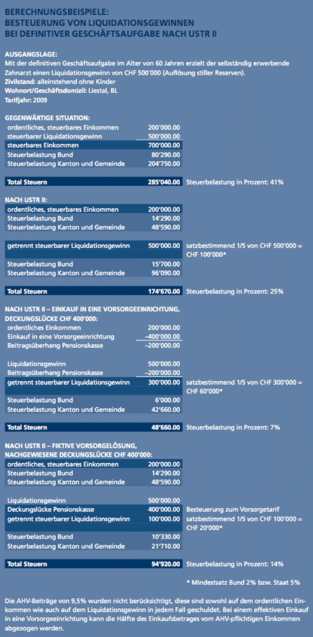 Mit vorangehenden Berechnungsbeispielen möchten wir die Steuerersparnisse mit den neuen Bestimmungen bei der definitiven Aufgabe einer Zahnarztpraxis aufzeigen. Neben dem ordentlichen Einkommen von CHF 200’000 wird bei der Geschäftsaufgabe ein zusätzlicher Liquidationsgewinn von CHF 500’000 erzielt. Gegenwärtig beträgt das steuerbare Einkommen CHF 700’000; die Steuerbelastung liegt bei 41%. Erfolgt die Geschäftsaufgabe nach dem 31.Dezember 2010, fallen deutlich geringere Steuern an (25% von CHF700’000): Durch die getrennte Besteuerung des Liquidationsgewinnes wird die Steuerprogression gebrochen, zudem kommt für den Liquidationsgewinn ein geringerer Steuersatz zur Anwendung. Die Steuerbelastung verringert sich zusätzlich, sofern eine Deckungslücke bei der persönlichen Vorsorge nachgewiesen werden kann. Am meisten Steuern können gespart werden, wenn ein effektiver Einkauf in eine anerkannte Vorsorgeeinrichtung erfolgt.