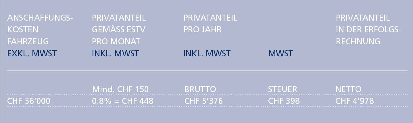 Die Bemessung des Privatanteils ist mit den Sozialversicherungen (AHV) und den Bestimmungen zum neuen Lohnausweis koordiniert und beträgt 9.6% des Fahrzeugkaufpreises pro Jahr. Nachfolgend zeigen wir Ihnen in konkretes Berechnungsbeispiel auf:
