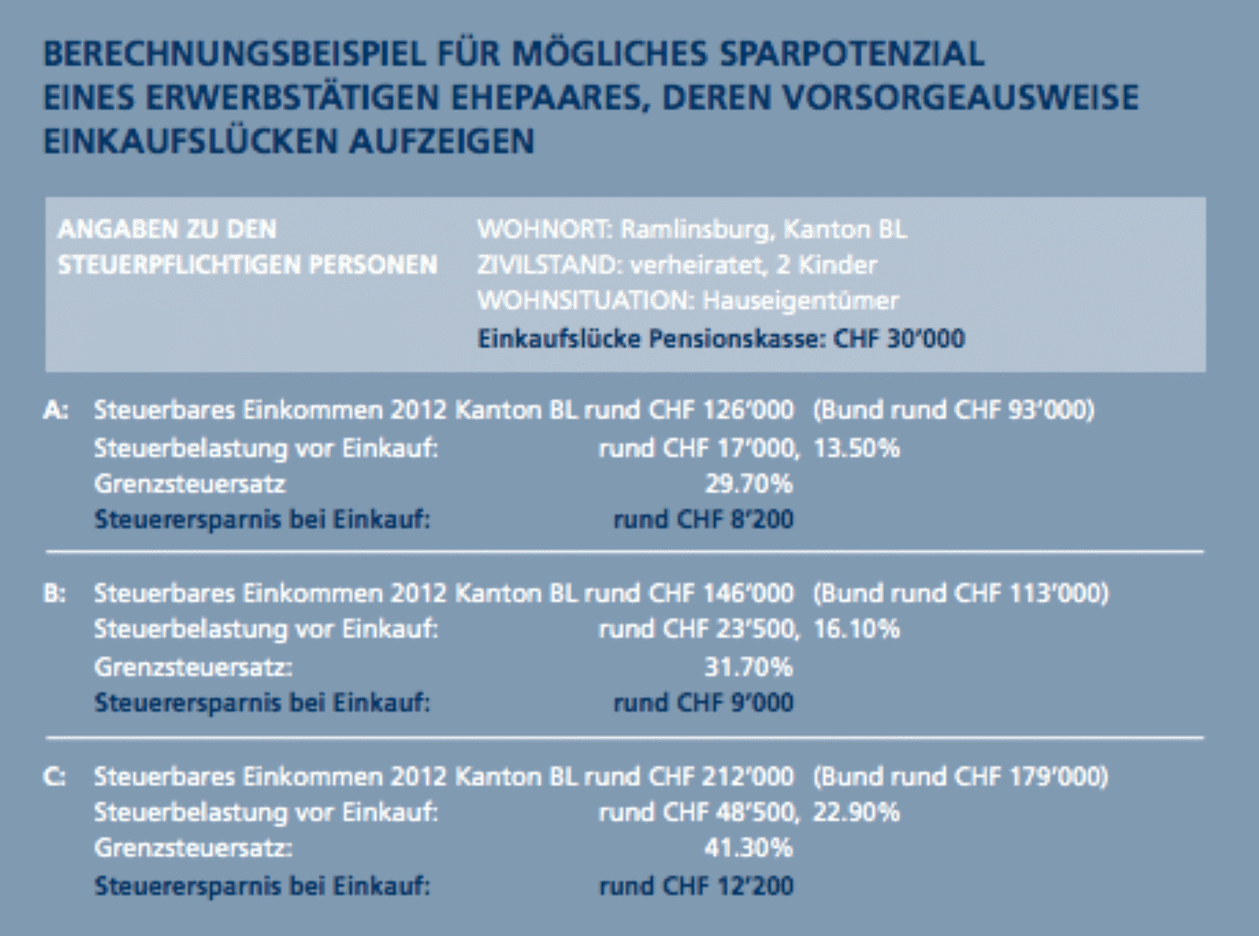 Die drei Beispiele zeigen deutlich, dass grosses Sparpotenzial vorhanden ist. Durch die progressive Ausgestaltung des Steuertarifs fällt der Spareffekt umso stärker aus, je grösser das steuerbare Einkommen ist. Die Berechnungsbeispiele lassen die Veränderung der Vermögenssteuerbelastung ausser Acht. Dazu ist aber noch anzumerken, dass sich durch einen Einkauf in die Pensionskasse auch das steuerbare Vermögen verringert, da Guthaben bei der Pensionskasse nicht steuerpflichtig sind.